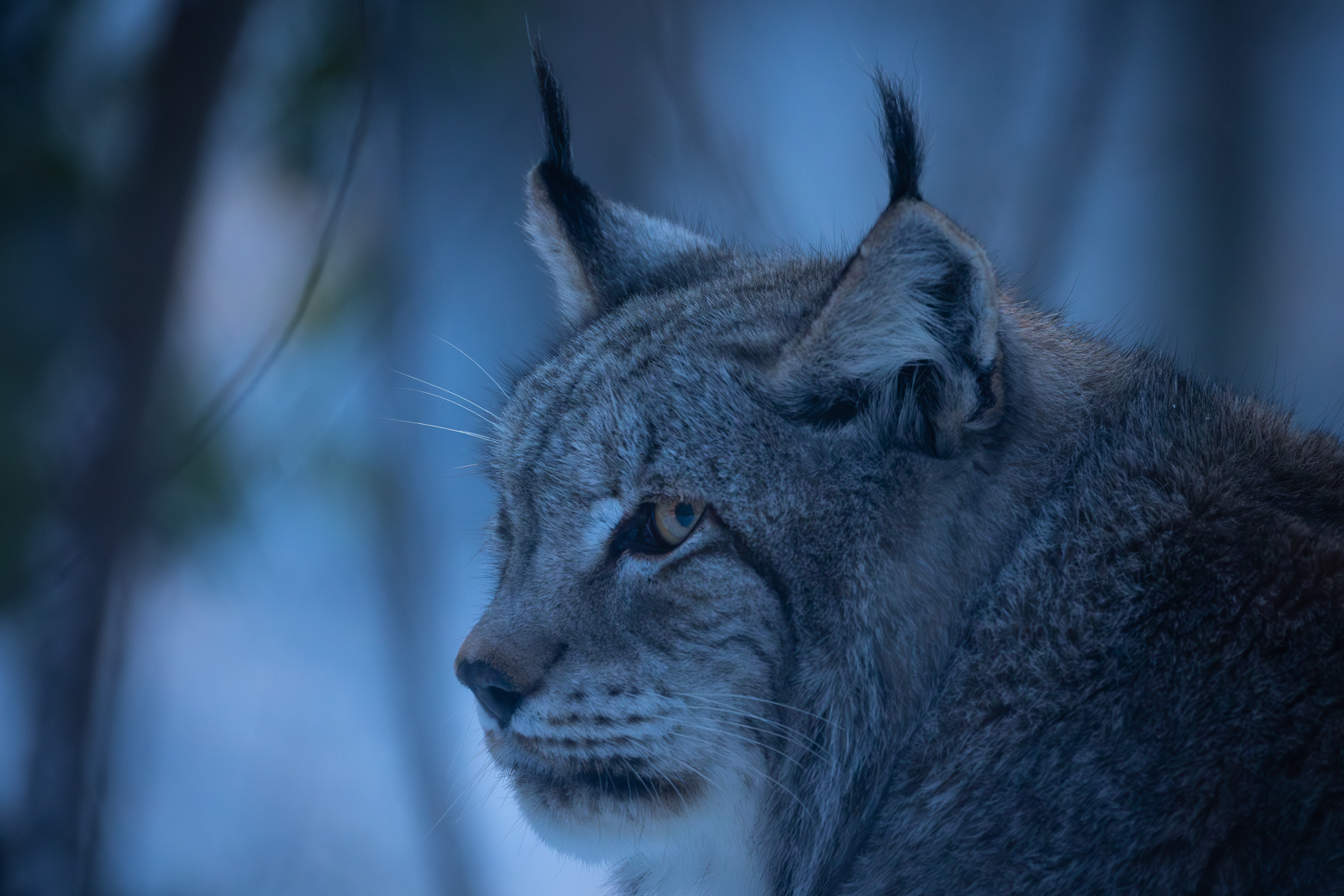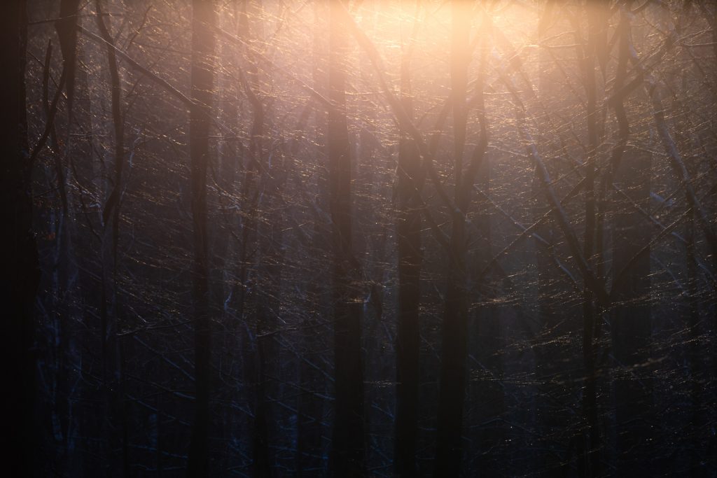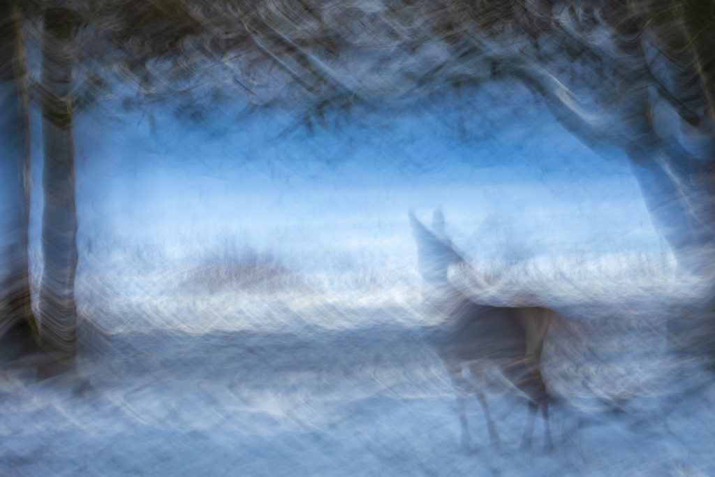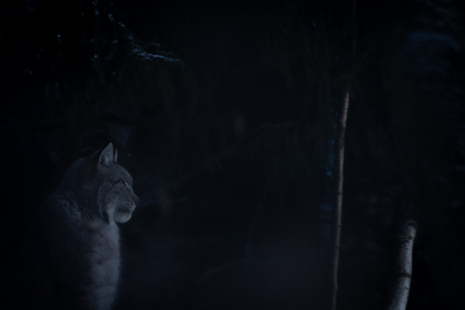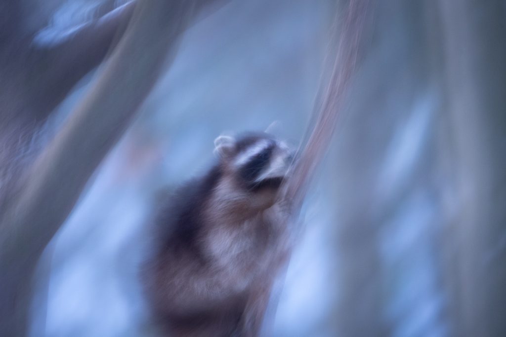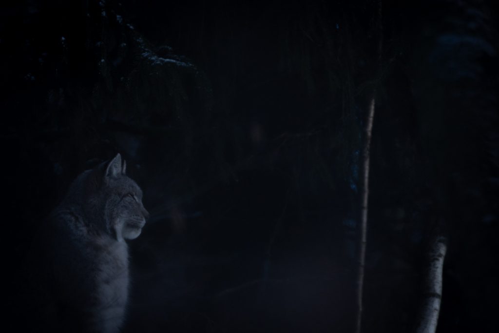 Die Lichtstimmung zum späten Nachmittag war gigantisch, doch wie das so ist: Die Tiere waren einfach immer an den falschen Stellen. 😉 Trotzdem konnten wir das eine oder andere zufriedenstellende Foto machen. Besonders die Hirsche auf der schneebedeckten offenen Fläche konnten wir winterlich in Szene setzen. Bei den Luchsen und den Waschbären war das ganze dann schon wieder schwieriger, da auf den Büschen und Bäumen der Schnee vom Wind bereits heruntergeweht worden war und wir so kaum winterliche Bilder machen konnten. Doch auch die düstere Stimmung der laublosen Bäume hat irgendwie was für sich.