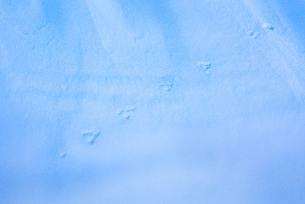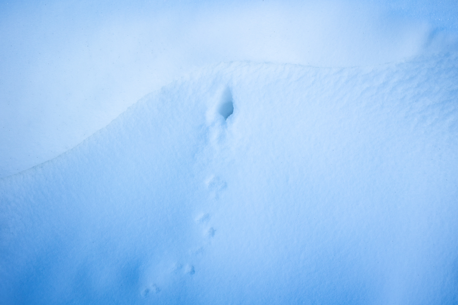 Doch die Schneeverwehungen ließen mich nicht los und so gingen wir am nächsten Tag noch einmal dorthin. Der Wind hatte nachgelassen und die Sonne schien sanft duch Schleierwolken hindurch, sodass die Kontraste nicht mehr so kräftig waren. Es hätte perfekt sein können, doch leider war ein Hund durch den tiefen Schnee gefegt und hatte große Teile dieses Wunderwerks zerstört. Doch hier und da gab es noch Teile, die sich durchaus in Szene setzen ließen. Besonders hatten mich die Spuren der Tiere begeistert. Hier eine Maus, die von einem Loch im Schnee zum nächsten geflitzt war, dort ein Kaninchen, dass erst umher geflitzt war und sich dann für eine Weile hingesetzt hatte. Und da ein Vogel, dessen Spur plötzlich mitten im Nirgendwo aufhörte.
